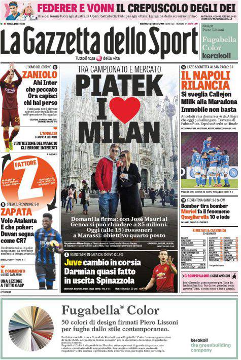 Gazzetta dello Sport, Corsport, Tuttosport: prime pagine del 21 gennaio 2019