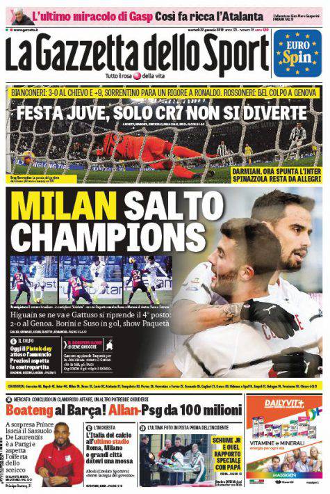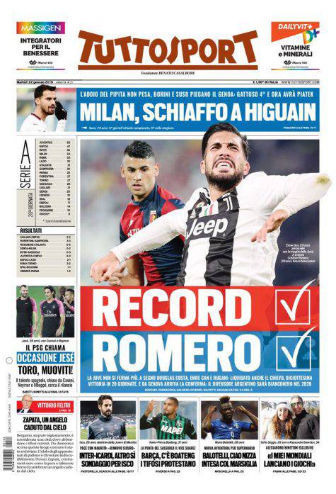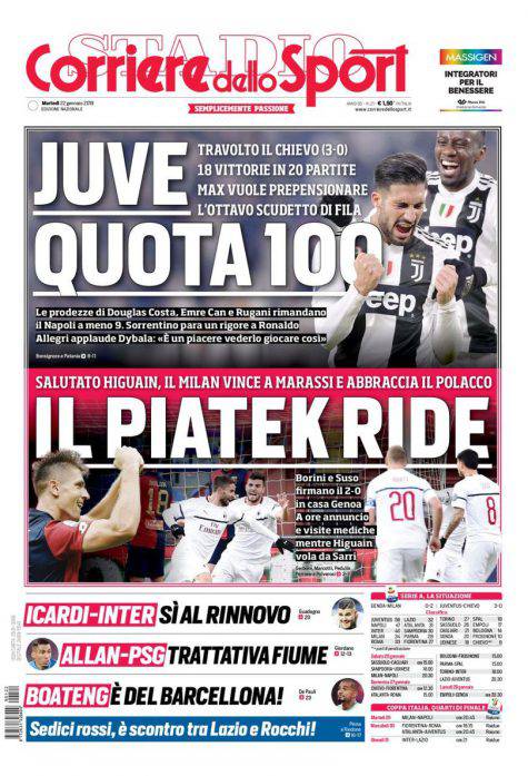Gazzetta dello Sport, Corsport, Tuttosport: prime pagine del 22 gennaio 2019 22/01/2019 - 08:00 di Pasquale Cacciola