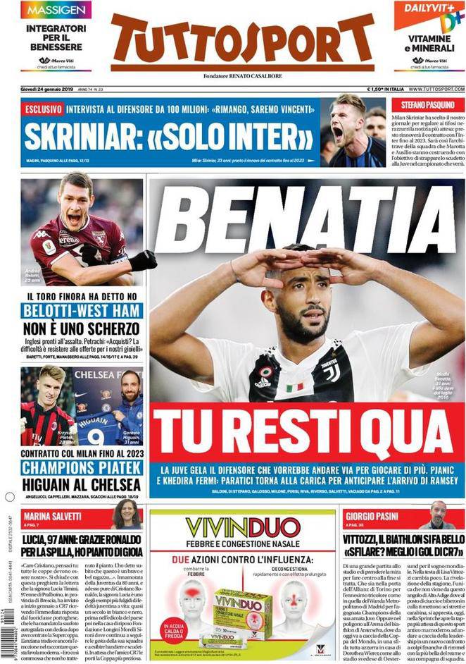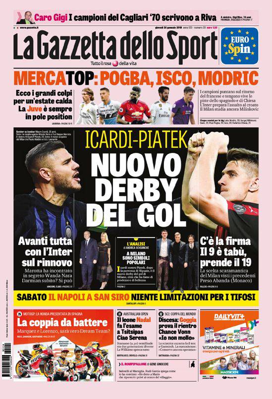 Gazzetta, Corriere dello Sport, Tuttosport: prime pagine 24 gennaio 2019 24/01/2019 - 08:18 di Matteo B.