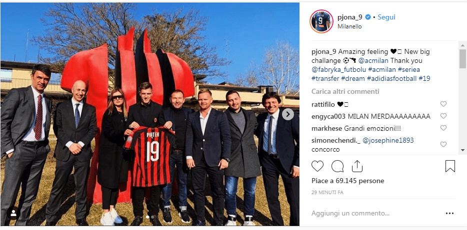 Piatek, dopo la conferenza, ha pubblicato sul suo profilo Instagram personale delle immagini che sintetizzano il suo primo giorno da calciatore del Milan. Foto che lo ritraggono insieme alla moglie, agli agenti e ai dirigenti rossoneri Leonardo, Maldini e Gazidis all’interno di Milanello con la sua nuova maglia numero 19 che lo accompagnerà fino a giugno 2023.