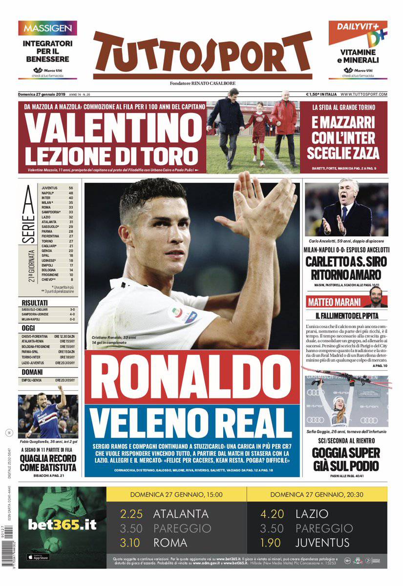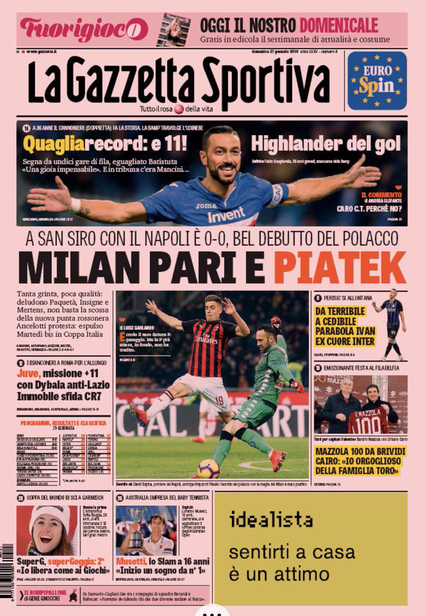 Gazzetta dello Sport, Corsport, Tuttosport: prime pagine del 27 gennaio 2019 27/01/2019 - 08:21 di Keivan Karimi