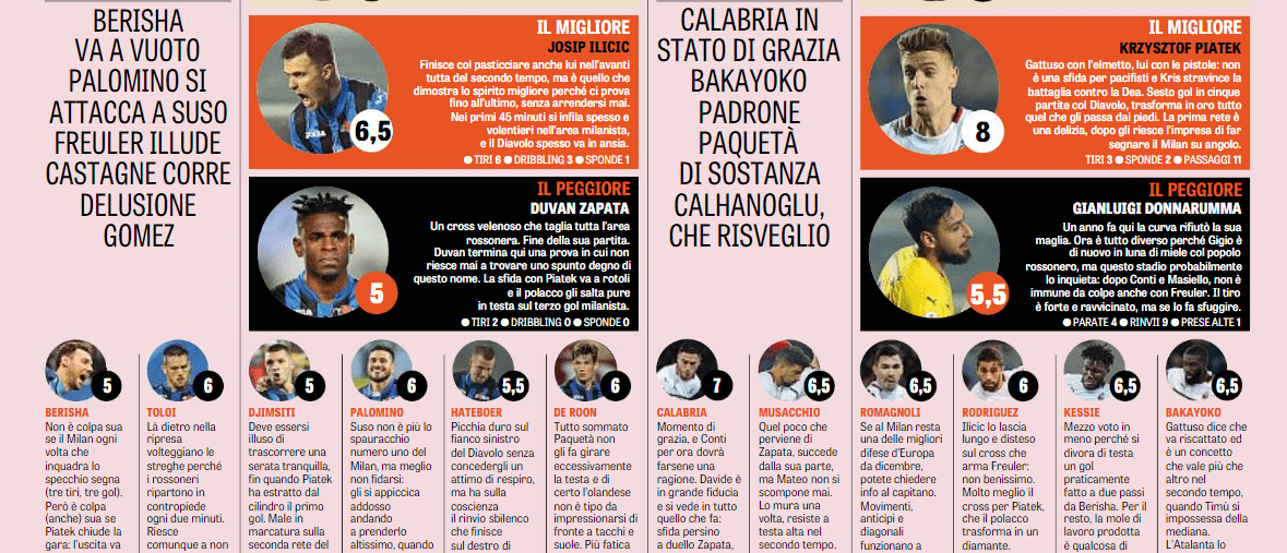 Come al solito la Gazzetta dello Sport ha pubblicato oggi voti e pagelle del match in questione; tanti i promossi meritatamente in casa Milan, a cominciare dall’8 assegnato a Krzysztof Piatek, il mattatore di serata autore di due perle vincenti che lo innalzano a ‘hombre del partido’. Voto 7 per l’altro marcatore Hakan Calhanoglu, che ritrova il gol e disputa una gara continua e molto positiva. Premiato con lo stesso punteggio anche Davide Calabria: straordinaria prova del terzino che vive un gran momento di forma e riesce pure a frenare lo scatenato Zapata.