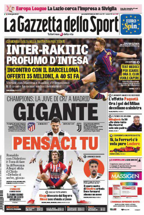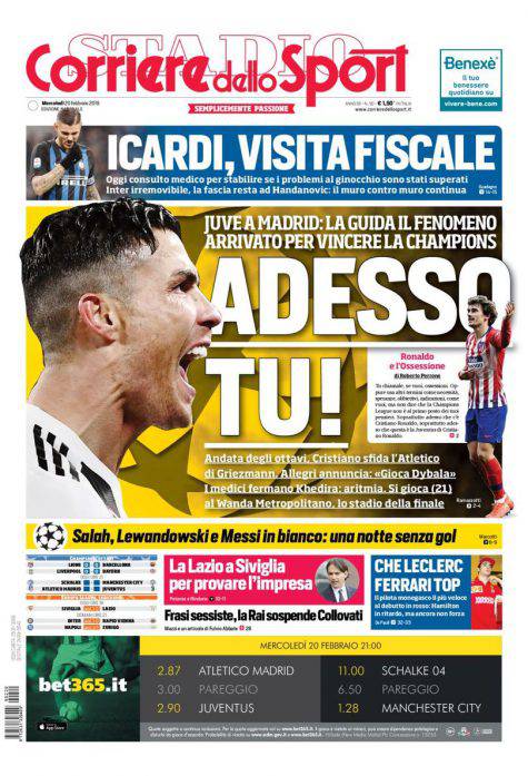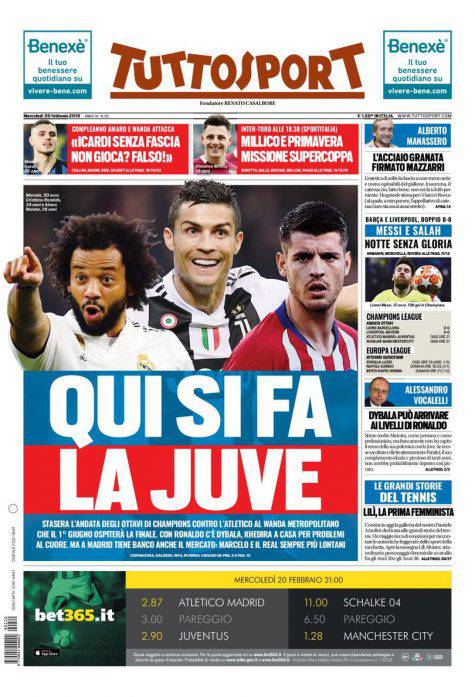 Gazzetta dello Sport, Corsport, Tuttosport: prime pagine del 20 febbraio 2019 20/02/2019 - 07:54 di Pasquale Cacciola