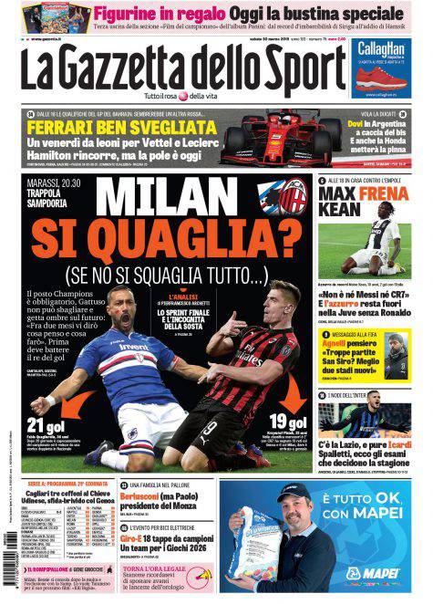 Gazzetta dello Sport, CorSport, Tuttosport: prime pagine del 30 marzo 2019 30/03/2019 - 08:06 di Pasquale Cacciola