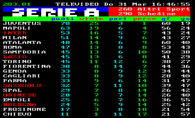 La Roma invece era impegnata all’Olimpico contro il Napoli di Carlo Ancelotti. Clamorosa disfatta per i giallorossi di Claudio Ranieri. Il risultato finale di Roma-Napoli è stato 1-4. Partita sempre dominata dagli azzurri, andati subito in vantaggio con uno splendido gol di Arkadiusz Milik. Sciupate altre clamorose occasioni per il raddoppio, e i padroni di casa agguantano il pareggio a primo tempo scaduto con un sacrosanto calcio di rigore, poi segnato da Diego Perotti. Nella ripresa ci si poteva attendere la rinascita giallorossa e il crollo azzurro, invece è ricominciato tutti come nel primo tempo: stavolta il Napoli ha concretizzato le due occasioni create, prima con ‘Ciro’ Dries Mertens su papera di Olsen, poi con l’attaccante scuola Milan Simone Verdi, che fissa il parziale sull’1-3. Reazione della Roma, traversa ravvicinata di Nzonzi, ma non basta: è ancora il Napoli ad andare in gol, con Amin Younes.