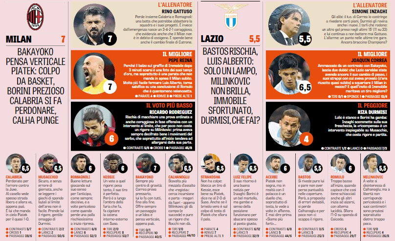 Milan-Lazio, le pagelle secondo la Gazzetta dello Sport