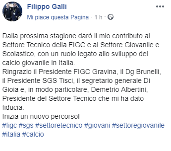 Galli oggi, sulla sua pagina Facebook, ha pubblicato un aggiornamento riguardo al suo futuro impiego all’interno della FIGC, un incarico importante del quale lo stesso ex rossonero tiene particolarmente.