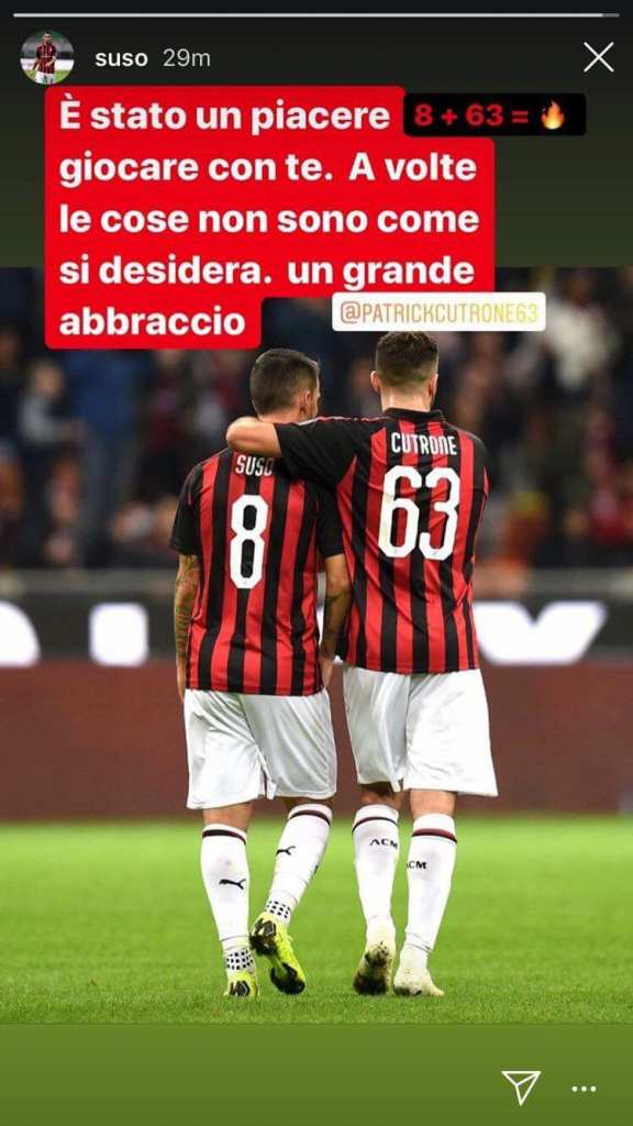 Anche Suso scrive un messaggio per Cutrone su Instagram per salutare Cutrone, oggi ufficialmente ceduto dal Milan al Wolverhampton. Una cessione sofferta.