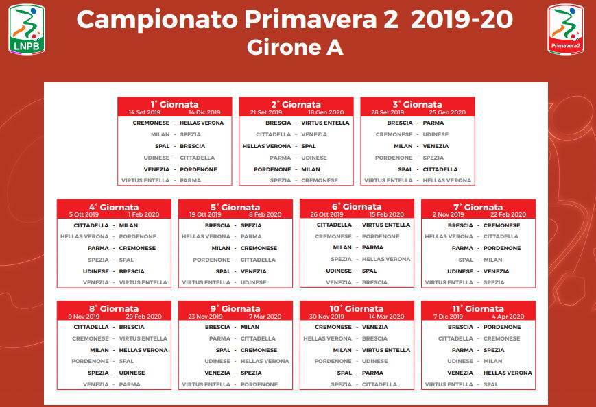 Il 9 novembre all’8ª giornata il Milan riceve l’Hellas Verona e il 23 va a Brescia. Gli ultimi due scontri del girone sono contro Virtus Entella e Udinese. Il ritorno comincia il 14 dicembre, ma poi ci sarà una pausa e il campionato Primavera 2 riprenderà solamente il 18 gennaio. La dirigenza rossonera vuole la promozione e pian piano cerca di migliorare la propria Primavera. Recentemente è stato ingaggiato il promettente Luan Capanni, reduce da un’ottima annata nella Lazio con tanto di esordio in Seria A nell’ultima giornata.