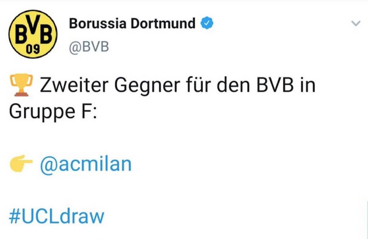 Durante il sorteggio di Champions League, il Borussia Dortmund ha taggato il Milan invece che l’Inter. Una vera e propria gaffe social per i tedeschi.
