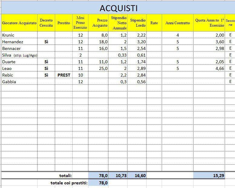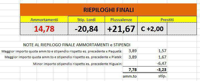 - Quanto ai Riepiloghi Finali nella cella che riguarda gli ammortamenti, così come in quella che riguarda gli stipendi, si tiene conto come aggravio la circostanza che Paquetà e Piatek hanno pesato sullo scorso esercizio contabile all’incirca per la metà del loro costo effettivo annuale perché tesserati nella sessione invernale. Sempre sugli stipendi, viene considerato risparmio il semestre riguardante Higuain per 3,5M netti.