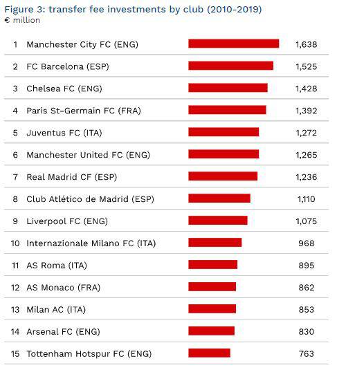 La prima italiana nella lista è la Juventus, al quinto posto grazie al miliardo e 252 milioni investiti. Decimo posto per l’Inter (968 milioni) e undicesimo per la Roma (895 milioni).