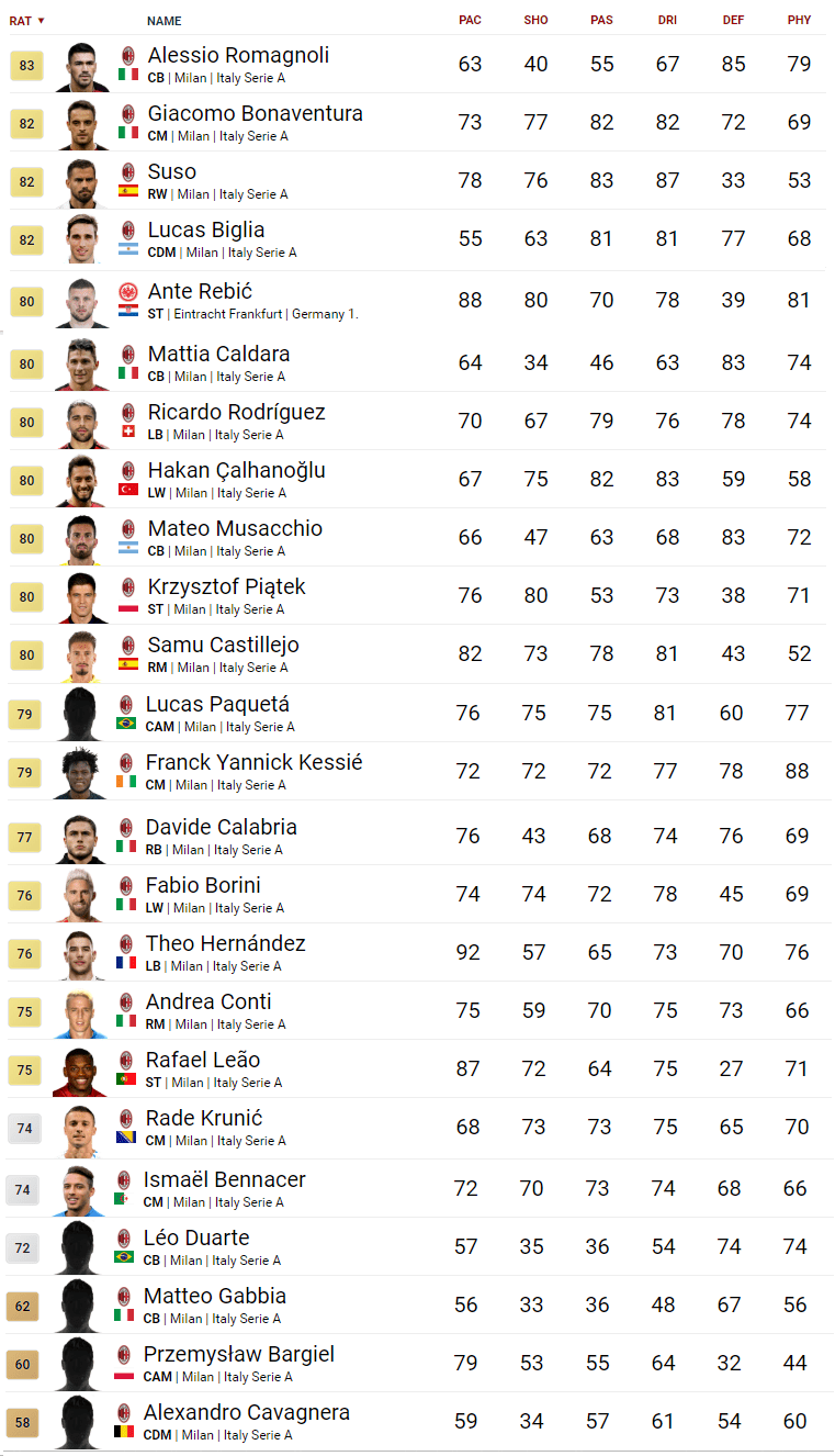 Secondo in questa speciale classifica è Alessio Romagnoli (83). Valutazione non altissima, e sulla quale non sono mancate grandi polemiche tra tifosi e appassionati. Tutti overall 82: Giacomo Bonaventura, Jesus Suso e Lucas Biglia. I primi due hanno, peraltro, “4 skills” e “3 stelle piede debole”.