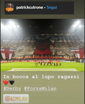 Stasera si gioca il derby di Milano e Patrick Cutrone è già in clima. Nonostante l’addio e la distanza, il suo cuore batte ancora per i rossoneri. L’ex attaccante ha pubblicato una foto sulle Instagram stories del suo profilo personale.