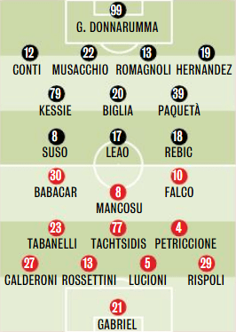 Sorprese in attacco: la gioventù di Rafael Leao e la duttilità di Rebic saranno presumibilmente preferite a Piatek e Calhanoglu, inizialmente in panchina. Conferma invece per Suso a destra nel tridente offensivo.