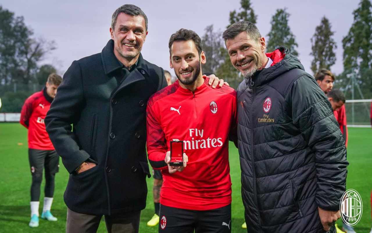 Oggi a Milanello prima dell’ultimo allenamento di rifinitura per Milan-SPAL, Paolo Maldini e Zvonimir Boban hanno consegnato un premio ad Hakan Calhanoglu.