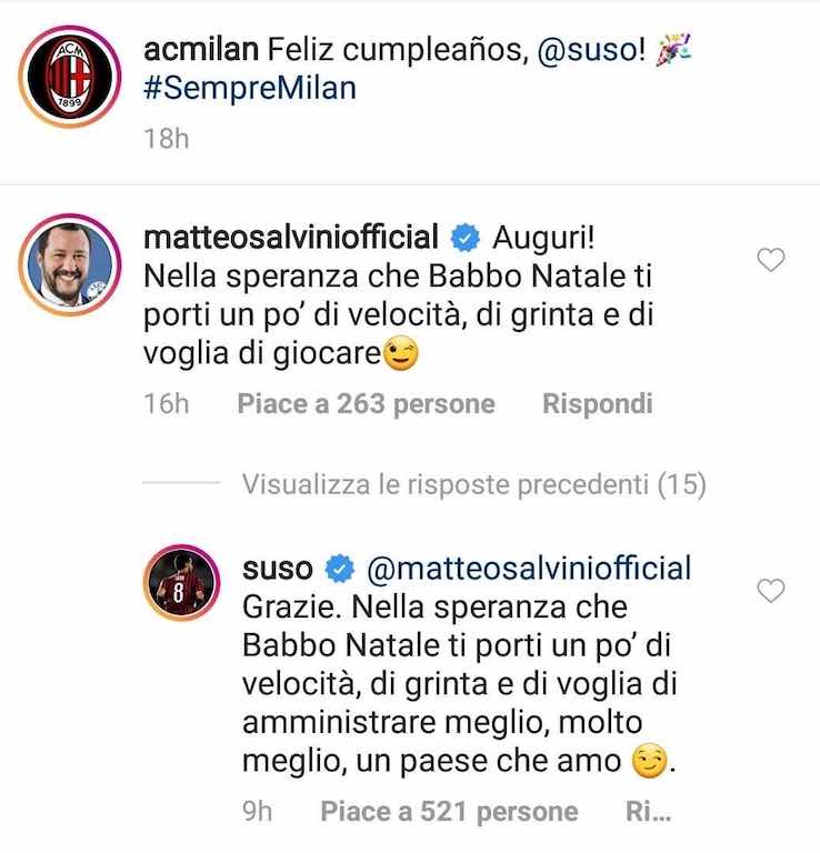 “Feliz cumpeanos, Suso!”, è questo quanto postato dalla società. Da lì l’intervento a gamba tesa e gratuito di Salvini, noto tifoso rossonero e già protagonista di alcuni screzi con l’ex allenatore Gennaro Gattuso. “Auguri! Nella speranza che Babbo Natale di porti un po’ di velocità, di grinta e di voglia di giocare”, ha scritto il leader della Lega. Da lì l’immediata replica dell’attaccante rossonero: “Grazie. Nella speranza che Babbo Natale ti porti un po’ di velocità, di grinta e di voglia di amministrare meglio, molto meglio, un paese che amo”.