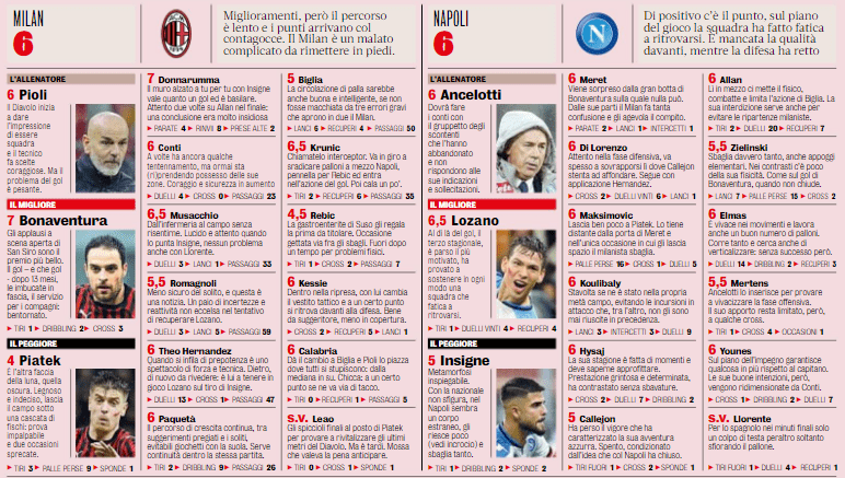 Come di consueto la Gazzetta dello Sport ha pubblicato stamane i voti e le pagelle assegnate ai calciatori di Milan e Napoli.