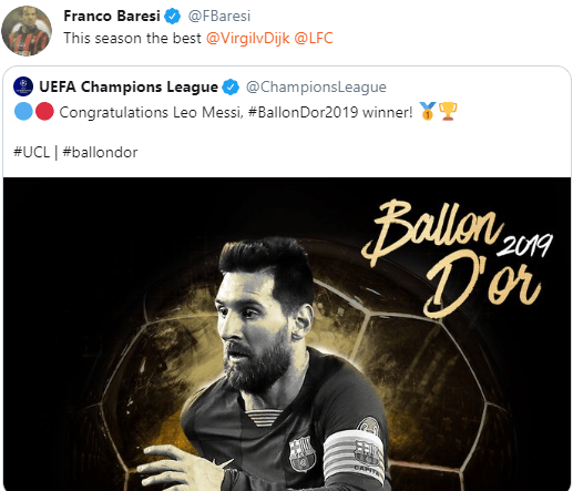 Tra questi va riportato il pensiero di Franco Baresi, il quale sul proprio profilo Twitter ha ricondiviso la foto di Messi con il Pallone d’Oro commentando: “Questa stagione il migliore è stato van Dijk del Liverpool”.