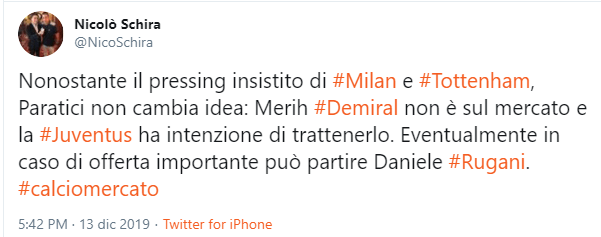 Lo conferma il giornalista de La Gazzetta dello Sport, Nicolò Schira, tramite il proprio account Twitter: “Nonostante il pressing insistito di Milan e Tottenham, Paratici non cambia idea: Merih Demiral non è sul mercato e la Juventus ha intenzione di trattenerlo. Eventualmente in caso di offerta importante può partire Daniele Rugani”.