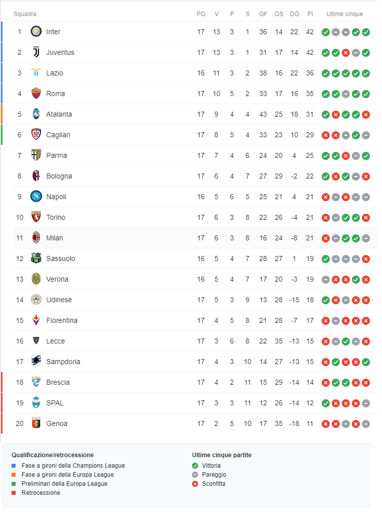 Classifica Serie A disastrosa per il Milan, superato anche dal Bologna di Sinisa Mihajlovic, vittorioso in trasferta contro il Lecce. Ecco la classifica completa.
