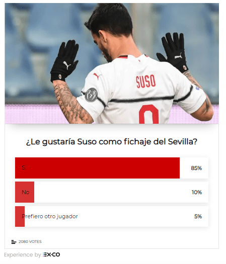 Nel sondaggio lanciato proprio da Marca, rivolto ai tifosi del Siviglia, viene chiesto se sarebbero favorevoli all’acquisto di Suso: plebiscito di voti positivi, percentuale oltre l’80% a favore del trasferimento in Andalusia.