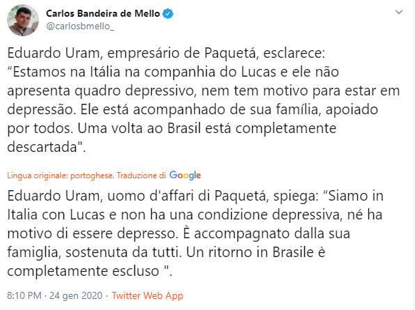 Proprio su Paquetà, oggi ha parlato il suo agente Eduardo Uram. Queste le sue parole, riportate dal giornalista di Lancenet, Carlos Bandeira de Mello: “Siamo in Italia con Lucas e non ha una condizione depressiva, né ha motivo di essere depresso. È accompagnato dalla sua famiglia, sostenuto da tutti. Un ritorno in Brasile è completamente escluso”.