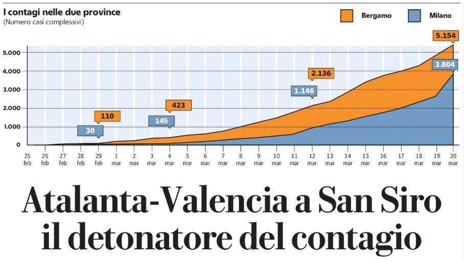 La Lombardia e soprattutto la provincia di Bergamo sono tra le zone più colpite dall’epidemia di Covid-19. In molti si interrogano sulle cause di questa diffusione con numeri davvero esagerati. Secondo quanto riporta l’edizione di stamani di Repubblica si sta facendo strada l’ipotesi che la partita di Champions League, Atalanta-Valencia, giocatasi a San Siro lo scorso 19 febbraio possa essere stato il vero ‘detonatore’ del contagio nelle province di Bergamo e Milano.