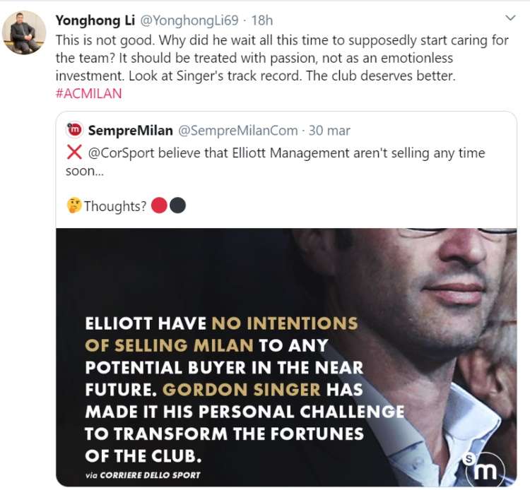 Questi i commenti fatti da Yonghong Li: «Questa cosa non è buona. Perché ha aspettato tutto questo tempo per iniziare presumibilmente a prendersi cura della squadra? Andrebbe trattata con passione, non come un investimento senza emozioni. Guardate all’esperienza di Singer. Il club merita di meglio».