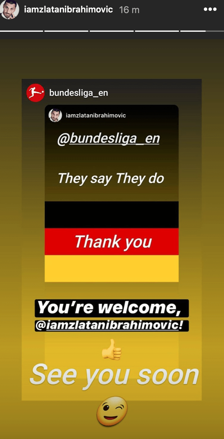 Sempre attraverso una storia Instagram, il giocatore del Milan ha strizzato l’occhio alla Bundesliga, affermando “Ci vediamo presto”. Indizio di calciomercato o semplice provocazione di Ibrahimovic?