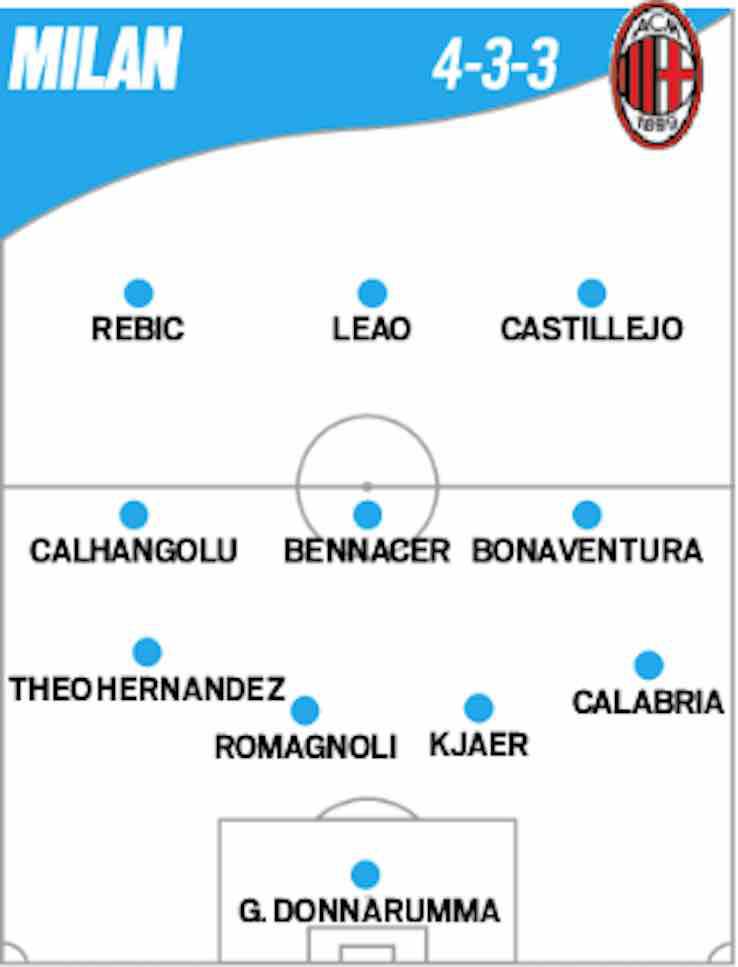 Intanto si ragiona su un possibile 4-3-3 per creare maggior densità in avanti. Leao la punta centrale, Rebic a sinistra e Castillejo a destra.