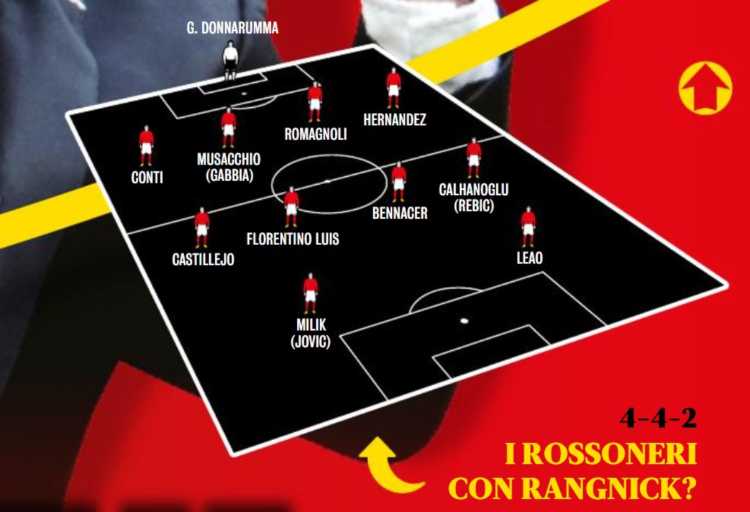 In mediana ci sarebbe uno di troppo, con Ante Rebic destinato addirittura alla panchina. Samuel Castillejo agirebbe infatti sulla destra, con l’eventuale acquisto Florentino Luis al centro accanto a Bennacer e con Hakan Calhanoglu pronto a occupare quella fascia sinistra attualmente di egemonia croata.