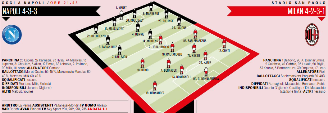 Come riportato dalla Gazzetta dello Sport, Gattuso e Pioli schiereranno le rispettive formazioni senza stravolgere nulla. Minimo turnover e conferma dei moduli di partenza.