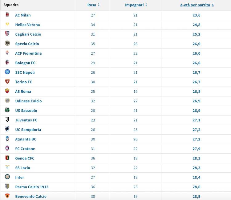 Guardando a solo campionato italiano, vediamo come alle spalle degli uomini di Pioli ci siano Verona e Cagliari, con 24,8 e 25,2. Tra le big il Napoli ha una media di 26,7 anni e la Roma 26,8. La più vecchia è l’Inter con 28,4, davanti solo a Parma(28,6) e Benevento (28,9). Juve, Atalanta e Lazio infine hanno 27,1, 27,2 e 28,3 di media.