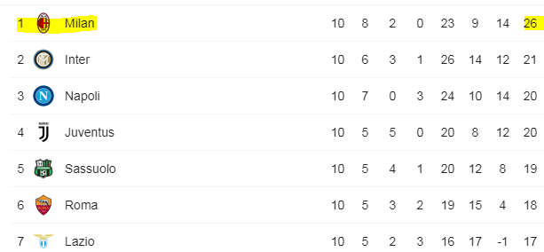 Il Milan sale a quota 26 punti in dieci partite giocate. Cinque i punti di vantaggio sui rivali cittadini dell’Inter, che battendo ieri il Bologna sono saliti a 21 punti. Terzo posto in comune per Juventus e Napoli a 20.