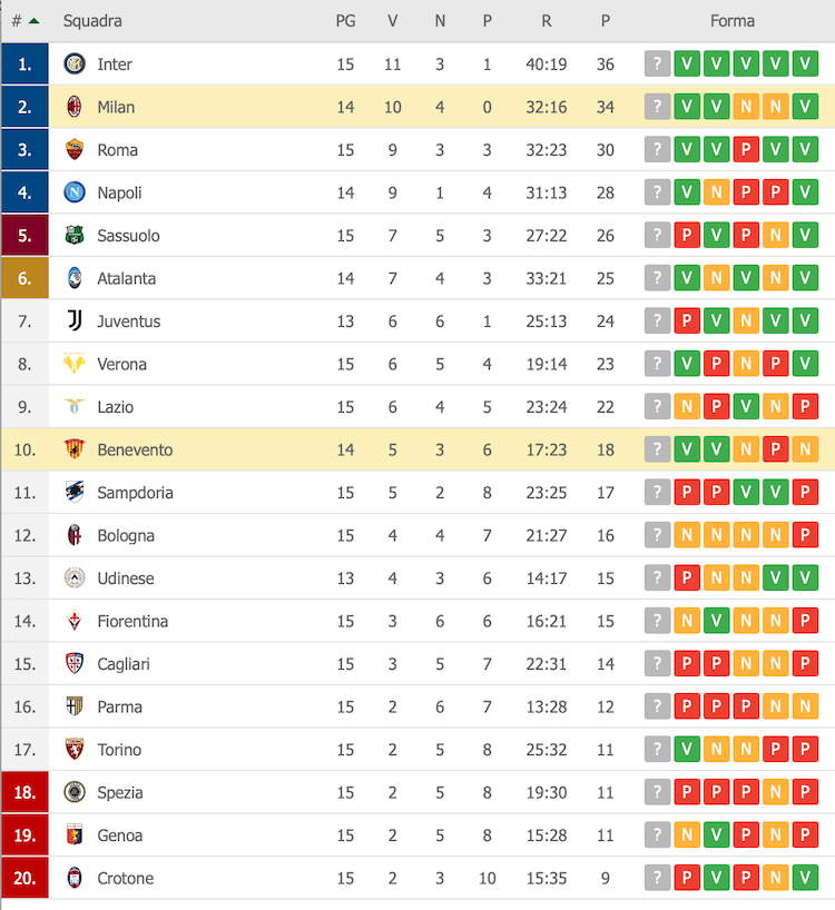 Ecco la classifica della serie A della 15a giornata:
