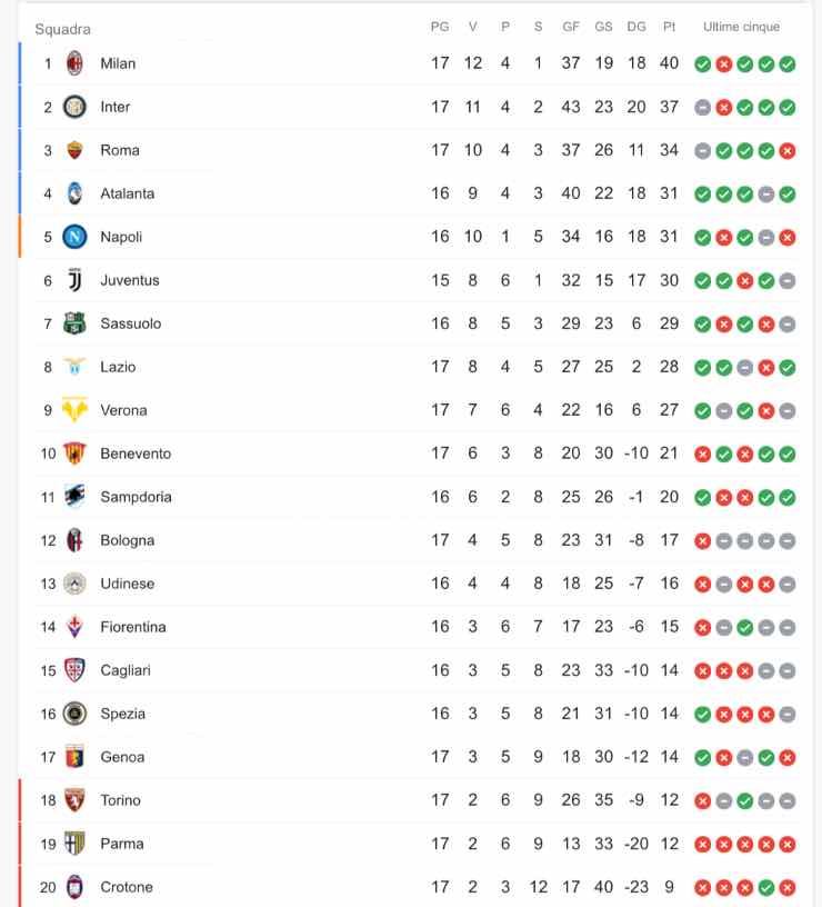 Ecco la classifica di Serie A aggiornata: