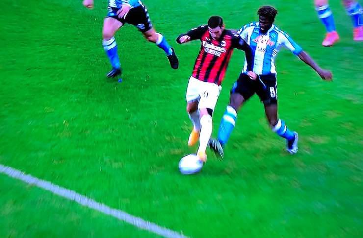 Nel finale di gara tra Milan e Napoli accade di tutto. Theo Hernandez, al minuto 86, viene abbattuto in area da Bakayoko, ma l’arbitro Pasqua nonostante il controllo al Var non concede il rigore. Eppure il tocco del centrocampista del Napoli sul terzino rossonero è assolutamente evidente. Theo Hernandez, spalle alla porta avversaria, era caduto a terra dopo che Bakayoko gli aveva pestato la caviglia.