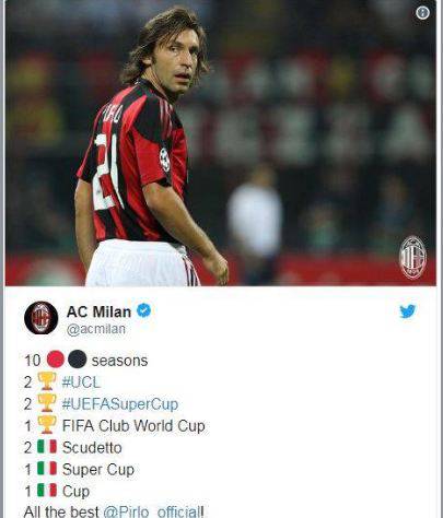 Di tweet su Pirlo però ne va ricordato un altro quello pubblicato dal Milan, il giorno del suo addio al calcio, il miglior riassunto di un decennio di storia calcistica indimenticabile anche – va detto – pure per qualche dolorosa sconfitta che ancora grida vendetta.