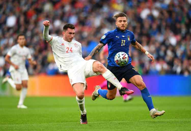 Agli azzurri è sembrato di giocare in casa al momento degli inni nazionali con gran parte dei tifosi presenti sulle tribune di Wembley a intonare quello dell’Italia. Il primo tempo comincia e finisce con la Spagna che prova a fare gioco e gli azzurri che non hanno l’incidere delle partite precedenti. Luis Enrique rinuncia a Morata e punta su Olmo falso nueve supportato da Oyarzabal e Ferran Torres. E’ proprio il giocatore del Lipsia a creare scompiglio nella difesa azzurra senza dare punti di riferimento a Bonucci e Chiellini. E’ sua la migliore occasione da gol per gli iberici nel primo tempo con una conclusione ravvicinata che costringe Donnarumma a una prodezza in respinta.