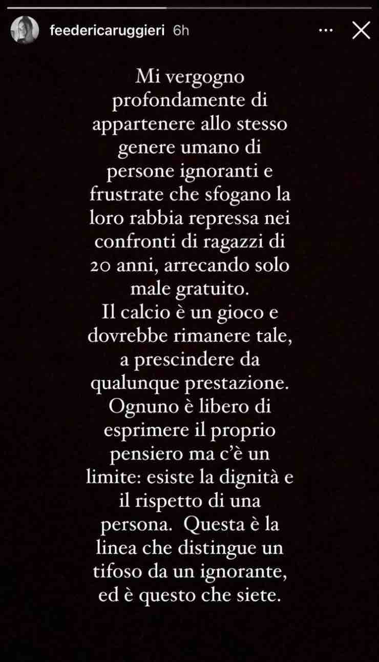 Un comportamento assolutamente inutile e irrispettoso e che andrebbe punito! Ci ha pensato la fidanzata di Gabbia a dare una lezione di moralità ai tanti che hanno offeso il rossonero. Federica Ruggeri ha postato una storia su Instagram criticando in maniera aperta e assolutamente costruttiva l’atteggiamento dei tanti tifosi rossoneri che hanno preso di mira Gabbia.