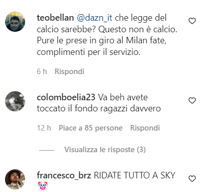 I tifosi milanisti infuriati anche con DAZN per il video postato quest’oggi che non riflette l’andamento reale della partita di ieri.