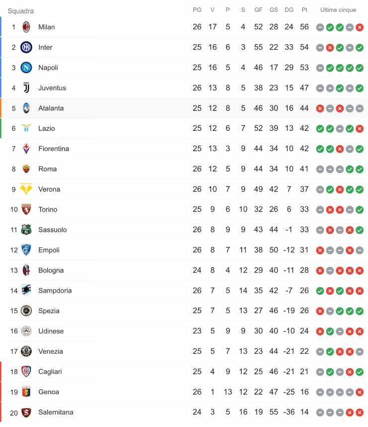La classifica di Serie A aggiornata dopo Inter-Sassuolo. I nerazzurri sono caduti in casa contro i neroverdi. Milan ancora capolista!