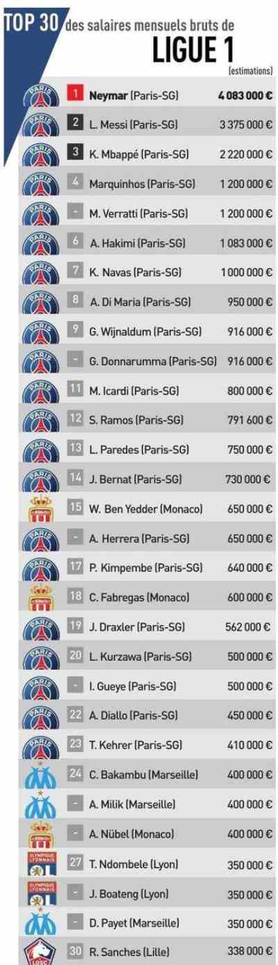 La classifica stilata da L’Equipe vede Neymar al primo posto con 4,083 milioni lordi al mese di ingaggio. Tutte le prime quattordici posizioni sono occupate da giocatori che militano nel PSG. Gianluigi Donnarumma è decimo con 916 mila euro lordi mensili, che su base annuale diventano 10,992 milioni.