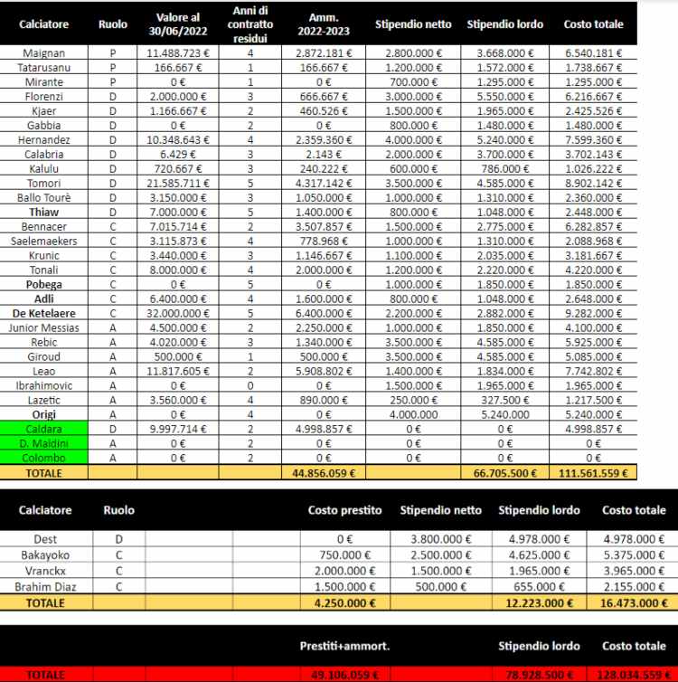 Calato dunque il costo complessivo della rosa, ovvero quanto il Milan dovrà spendere nella stagione in corso per mantenere la squadra costruita da Paolo Maldini.