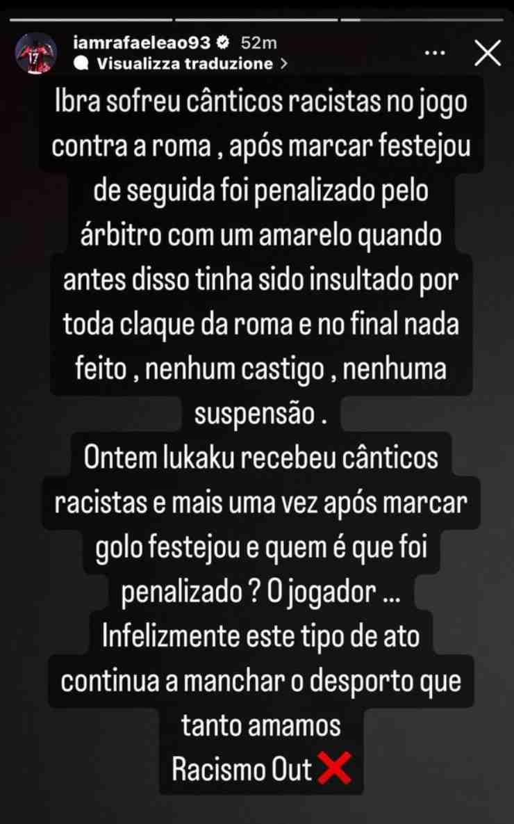 Anche Rafael Leao è intervenuto nella vicenda e ha pubblicato una storia Instagram nella quale ha citato pure Zlatan Ibrahimovic: “Ibra ha subito cori razzisti in una partita contro la Roma, dopo aver segnato ha festeggiato e fu ammonito dell’arbitro nonostante fosse stato insultato dai tifosi della Roma. Alla fine non è stato fatto nulla, nessuna punizione, nessuna sospensione. Lukaku ha ricevuto cori razzisti, dopo aver segnato ha esultato e chi è stato punito? Il giocatore. Purtroppo questo tipo di atti continua offuscare lo sport che amiamo così tanto. Razzismo out“.