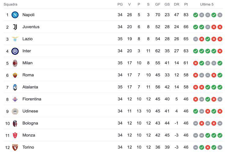 La classifica di Serie A aggiornata dopo la sconfitta del Milan contro lo Spezia. Si mette molto male per i rossoneri, con le speranze quarto posto ormai nulle