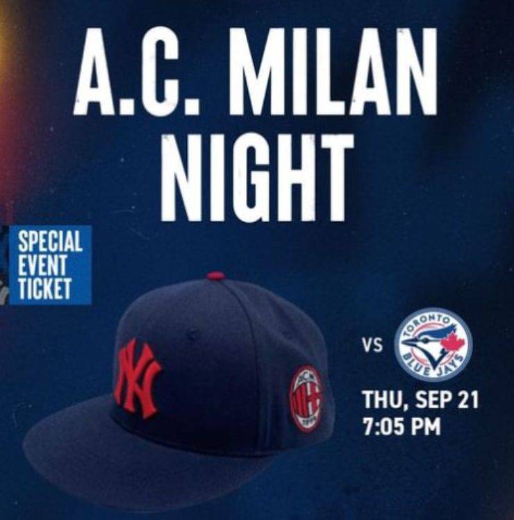 Per l’occasione, l’evento in questione è stato chiamato “AC Milan Night“, proprio per omaggiare questa partnership con la squadra di calcio italiana. Chi acquisterà il cappellino potrà ritirarlo direttamente allo stadio degli Yankee il giorno della partita, al livello 100 presso il cancello 2.