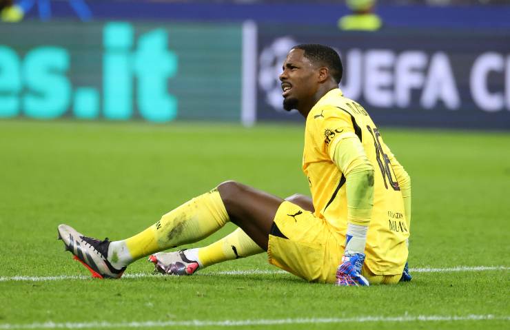 Mike Maignan seduto a terra guarda qualcuno con sguardo contrariato