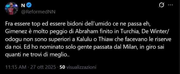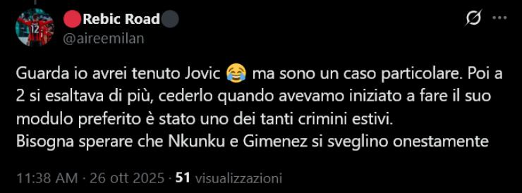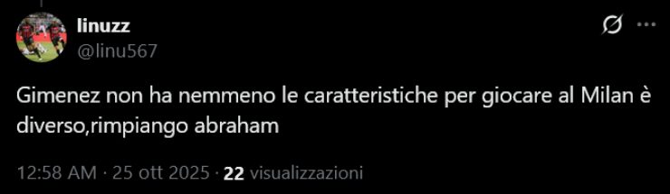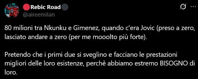 Il malcontento sta crescendo anche tra i tifosi, c’è persino qualcuno che ritiene che sarebbe stato meglio tenere Tammy Abraham o Luka Jovic invece di puntare su El Bebote. Di seguito alcuni tweet dopo Milan-Pisa 2-2. Ovviamente, qualcuno magari esagera, più che rimpiangere i due ex rossoneri, probabilmente rimpiangono il fatto che la dirigenza non abbia preso un centravanti adatto alle esigenze di Allegri.